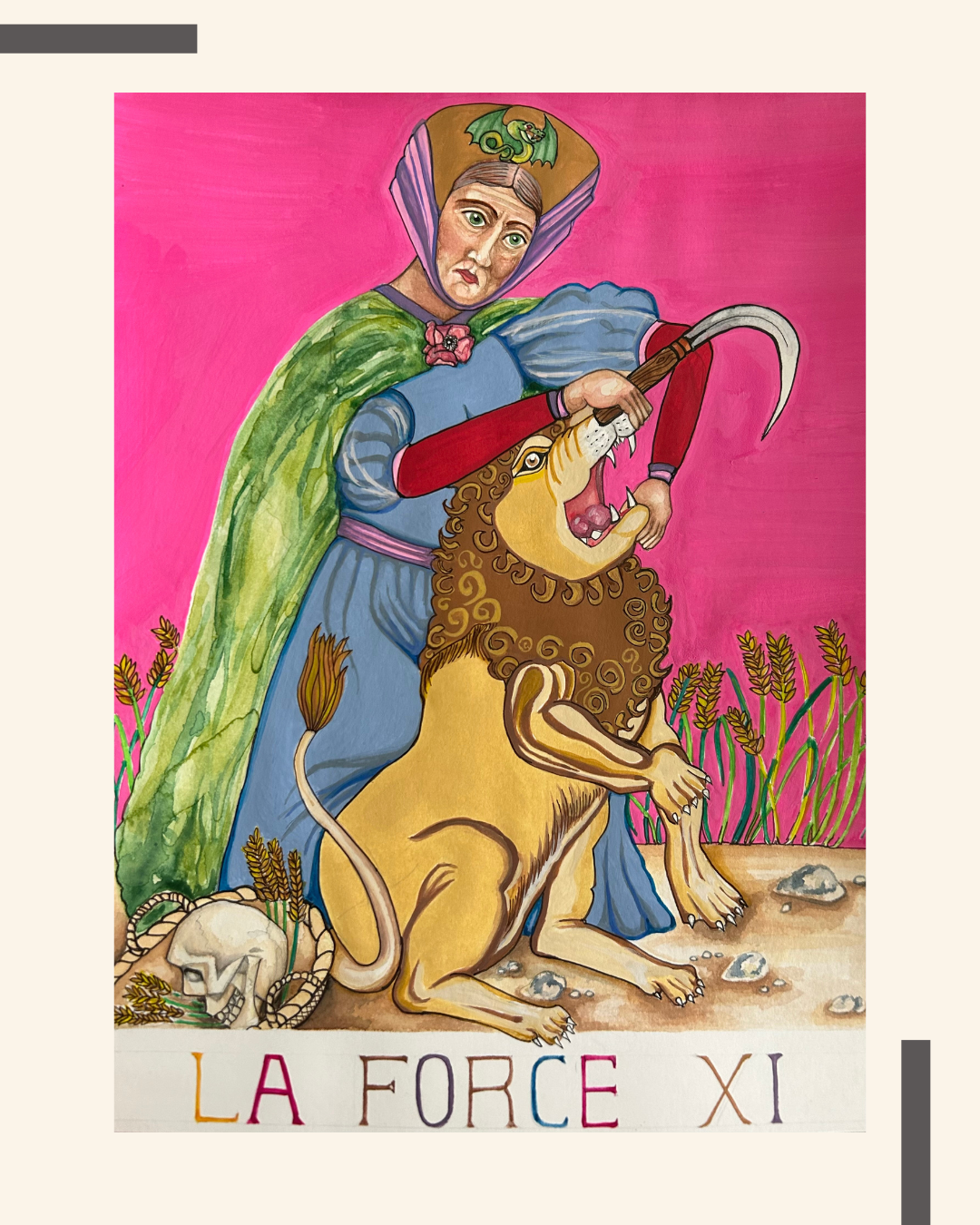 In the original Tarot deck, the Strength card features a woman wrestling with a lion, an exhortation to fight against both outer and inner struggles knowing that the outcome can never really be won without some kind of battle scar. In Shakespeare’s play Coriolanus, Volumnia is the hero’s mother, a post-menopausal grandmother pushing her son from battlefield victory to victory until her mercenary drive leads to his death. Think Angela Lansbury in The Manchurian Candidate. Like the emblem of the Roman empire that she so passionately defends, Volumnia is the ‘she-wolf’, the ambitious woman frustrated by the limitations that all patriarchies place upon females, forcing them to channel their talents and live vicariously through their menfolk. She boasts that even if she had a hundred sons, she would rather them all die on the battlefield in honour than live as cowards. Volumnia revels in her son’s wounds and massive body count, claiming that he sucked his valour from her breasts in infancy. In my card, Volumnia is portrayed as the archetypal Devouring Mother: with sickle in hand, like the classical goddess Ceres in her darker aspect, she reaps the bodies of men as if they were no more consequential than wheat stalks. Such is the strength of Mother Nature. As the Wolf Mother, Strength also reminds us of the absolute power of maternal instinct, a force that is bestial, sometimes violent, and always incomparable.