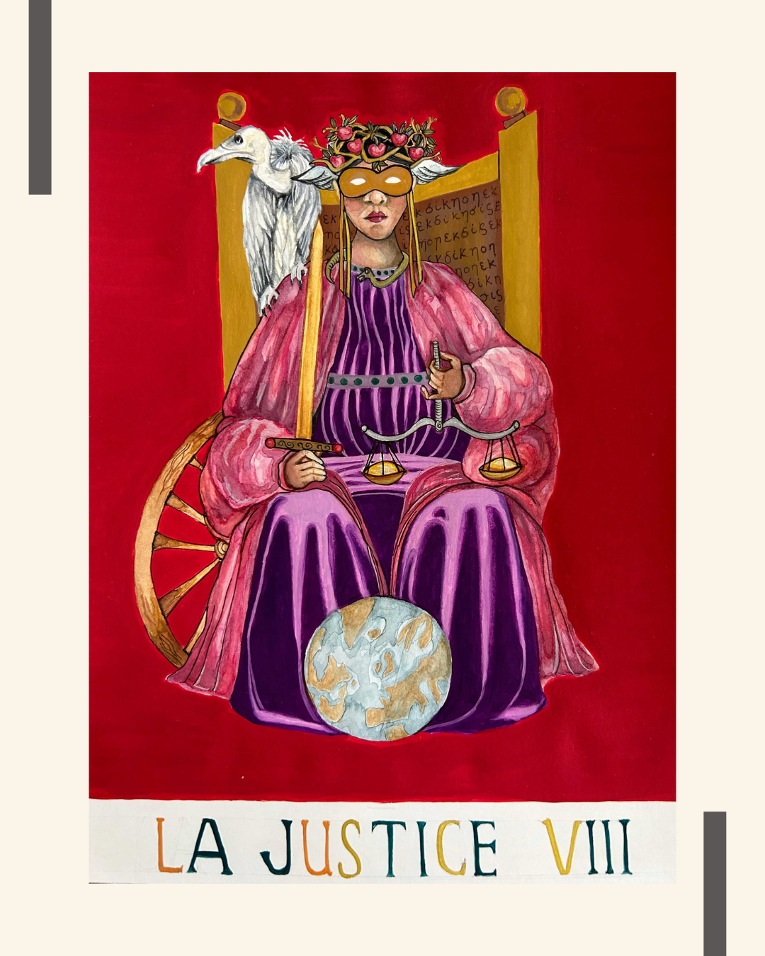 Ah, yes, Justice. In her Greco-Roman incarnation, she is portrayed as blindfolded to represent her supposed impartiality. But we women know that this western notion of institutional justice is bullshit: when has the system ever served the best interest of the weak, the poor, the marginalised, the despised? But in her original guise, Natural Justice, the goddess Themis, had a much different form and reputation. Sometimes portrayed as multiple entities like the Furies or Harpies, or as the singular entity known as Nemesis, Ate, or Tyche, she was the personification of Revenge. Even Zeus, the king of the gods, couldn’t compel or restrain her. Justice (or Revenge, Retribution or Righteous Anger) exacted a brutal vengeance upon those who murdered innocents, pursuing them through life and even after death. Despots and tyrants feared her and sometimes showed compassion to their subjects solely in order to escape Justice’s wrath. Overseer of the universe (yoni-verse), Justice’s vicissitudes connected her with Time and the seasons, hence in my card she is pictured with symbols of the globe, the solar wheel, the vulture, horse’s bridle and her traditional scales. Pulling the Justice card reminds us that sometimes it takes time, perhaps even centuries, before the cosmos rights any wrongs, yet righted they shall be. In Shakespeare’s play Titus Andronicus, the peri-menopausal Queen of the Goths — the dreaded Tamora — devotes the latter stage of her life to pursuing vengeance against the Roman general who sacrifices her son as a spoil of war. Tamora even dresses as Revenge to drive her enemy insane after she has ordered her other sons to rape, murder and mutilate Titus’s daughter and other children. After his family is decimated by Tamora’s vengeance, Titus prays to the goddess Astrea, petitioning her to return to earth to restore her power. Astrea was yet another incarnation of Justice but one connected with the heavenly powers of the newer Olympian gods — not like the chthonic primal, darker forces of the retributive Titans like Nemesis and her ilk. And that is Titus’s fatal error: he prays to a version of Justice that has been on earth all along, but he has been unable to recognise her in her merciless human incarnation as Tamora. Eventually learning Tamora’s brand of justice, Titus makes Tamora unwittingly eat her own sons baked in a meat pie before stabbing her to death. Tamora is a complex character: she charms everyone she meets, is a formidable ruler and warrior, yet she is capable of breathtaking acts of cruelty and savagery, even ordering her infant to be killed lest its appearance reveal her infidelity. Having overstepped the boundaries of natural justice, in the end, Tamora, too, is made to realise that to those who have wronged her, Justice, or whatever we choose to call her, is a complete bitch.